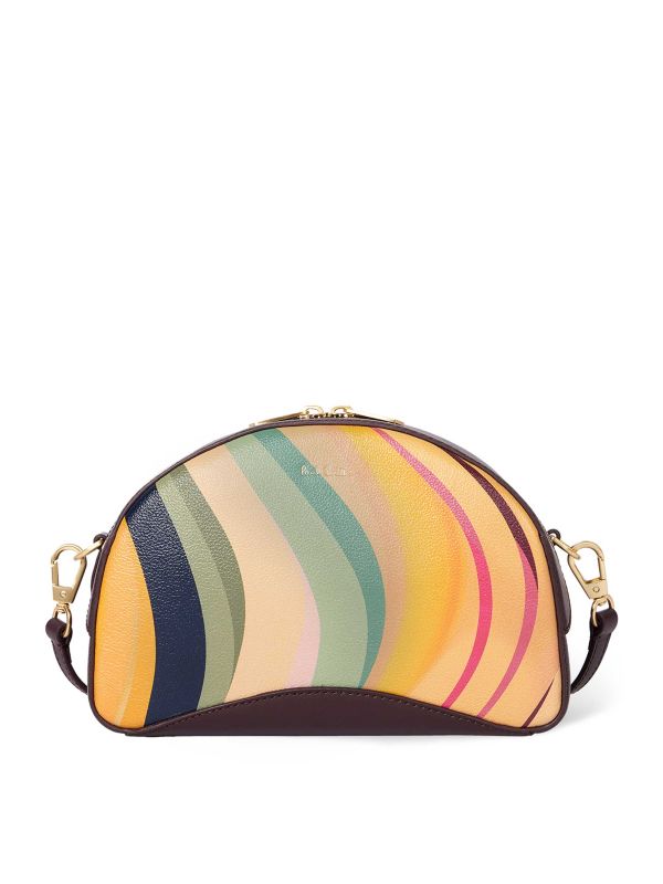 The Dusky Swirl Leather Curved Camera Bag from Paul Smith is crafted from 100% leather. Designed with a chic curved shape, this Paul Smith bag is perfectly sized for holding your camera. It showcases the brand's new 'Dusky Swirl' print, a rainbow-coloured stripe pattern. It's finished with a two-way zip closure and a removable shoulder strap for versatility when styling.