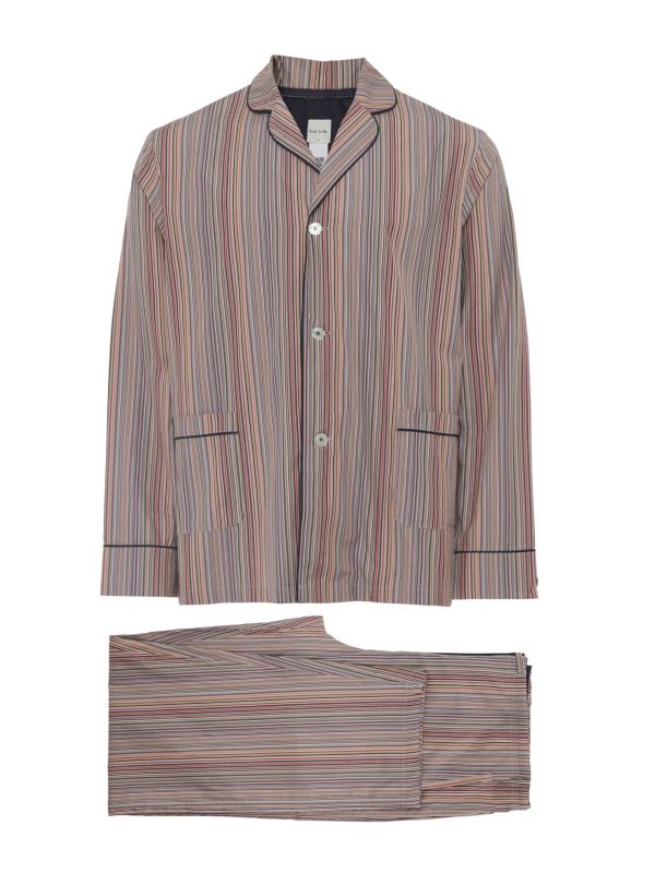 The Paul Smith pyjama set brings Italian craftsmanship and signature style to your loungewear. Made from soft Italian cotton, the set includes a top with notch lapels, button closure, and patch pockets, paired with matching bottoms featuring a drawstring waist with button fly for adjustable comfort.