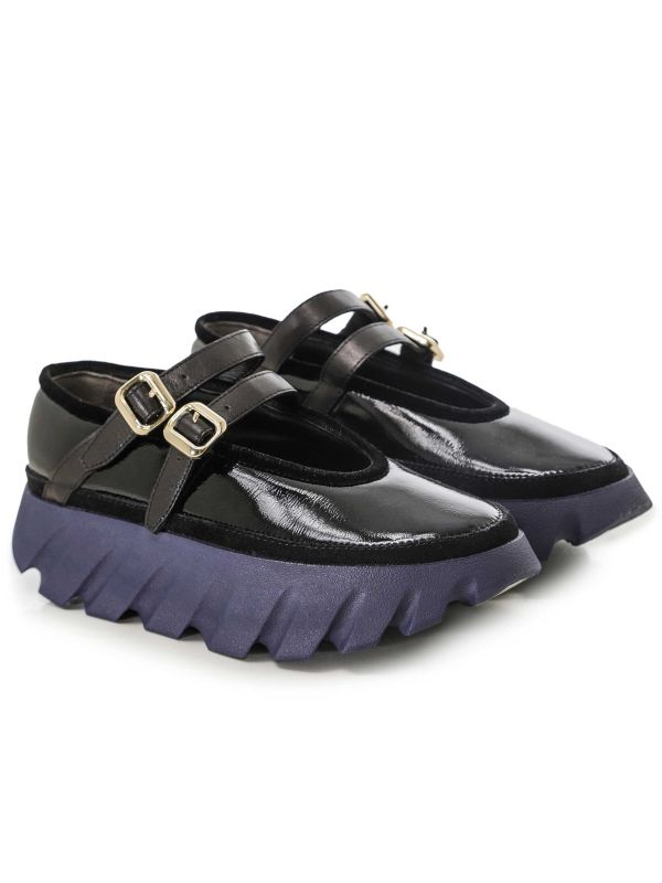 The Tura Ballet Platform Shoes by 4CCCCEES are a statement design inspired by ballet pumps. These 4CCCCEES shoes showcase a patent leather upper and two leather straps with adjustable buckles. They're finished with a velvet trim and set on a purple platform sole crafted from foam rubber. Wear yours to add height and vibrancy to your outfits.