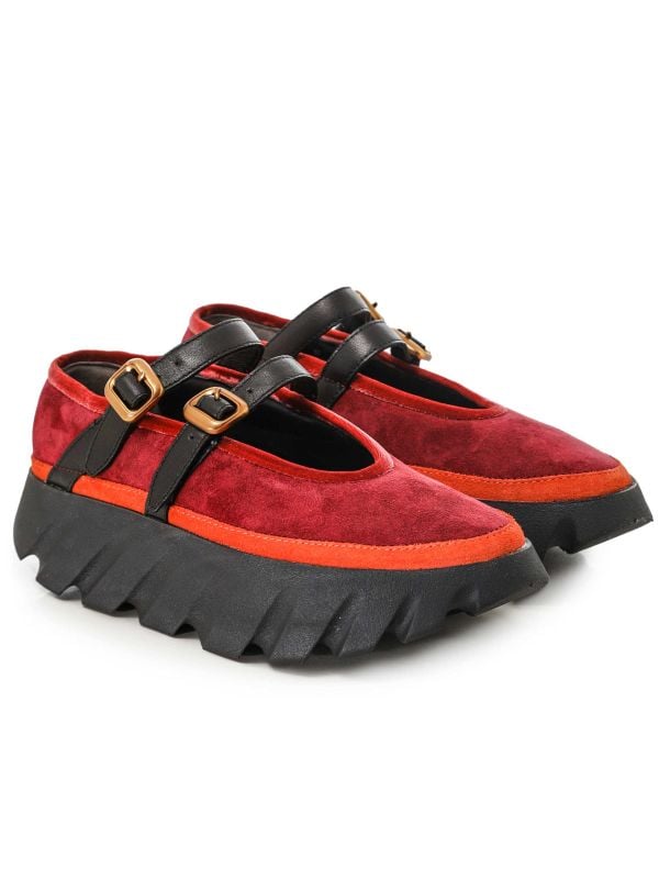 The Tura Suede Platform Shoes by 4CCCCEES are the ultimate statement shoe. Featuring a suede upper in a luxurious red hue, a red velvet trim, two leather straps with adjustable buckle fastenings and a foam rubber platform sole, these 4CCCCEES shoes are a bold and unique choice for any collection.