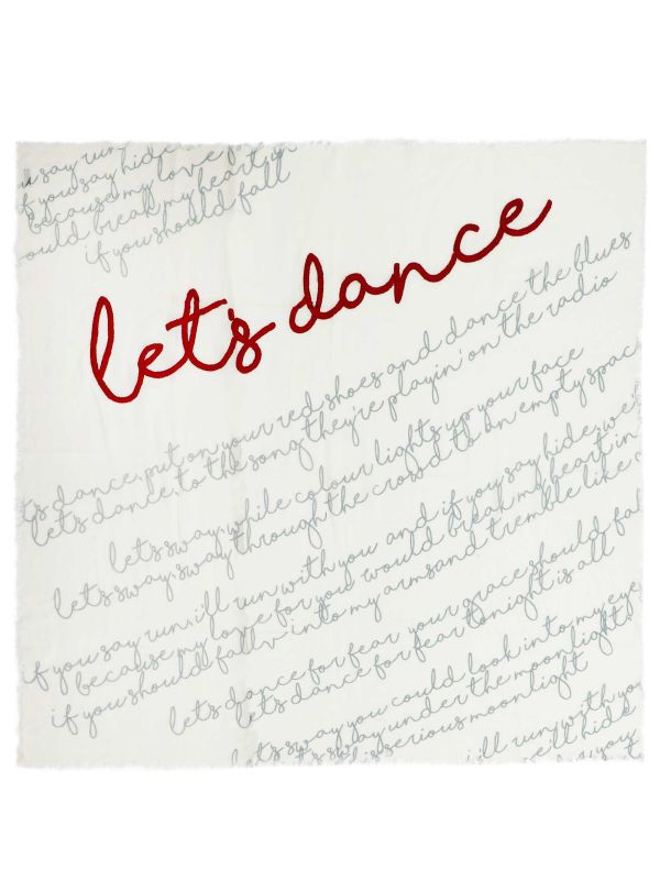 Add a touch of intrigue to your accessories collection with the Let's Dance scarf by Ahujasons. Made in India from 100% wool, this soft and luxurious Ahujasons scarf is lightweight and perfect for layering over knitwear and outerwear. It's adorned with lyrics from a David Bowie song, with bold red embroidery that reads "Let's Dance" and the remaining lyrics throughout. It's complete with frayed edges.