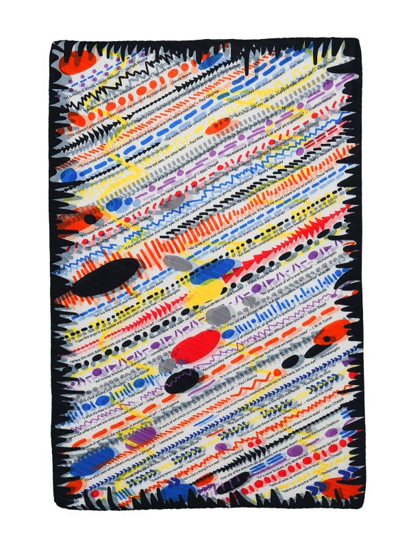 Alexandra Tsoukala took inspiration from the words of artists and philosophers when creating her Art scarf. She wanted to carry these important quotes about art with her, so decided to print them on a scarf alongside vibrant brush strokes. This striking accessory is handcrafted from luxurious pleated satin and boasts a sculptural design.