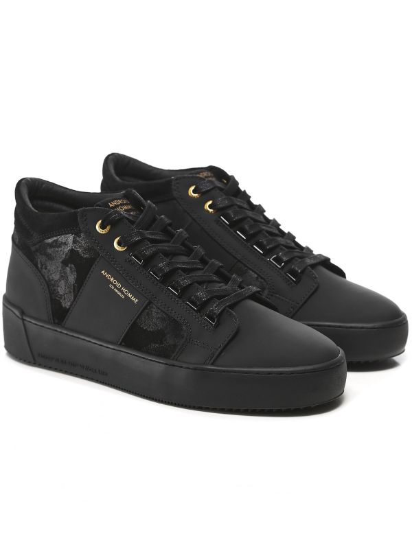 The Android Homme camo Propulsion Mid sneakers are the perfect off-duty option for the modern gent. Showcasing a mixed panel appearance including Goma leather and suede camouflage sides, the mid-top sneakers exude contemporary, urban style. Featuring a five D-ring and two eyelet lace-up, cupsole and a tooth tread for exceptional grip, whilst the monotone black colourway exudes a sleek and dynamic aesthetic.