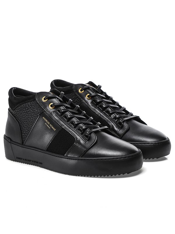 The Android Homme Raptor Propulsion Mid sneakers are a super slick sneaker ideal for city dwelling. Crafted in premium leather uppers, the mid-top sneakers showcase a mixed panel appearance including tumbled texture sides and a padded leather ankle cuff. Featuring a five D-ring and two eyelet lace-up, cupsole and tooth tread for exceptional grip, whilst the monochromatic black colourway exudes a sleek and dynamic aesthetic.