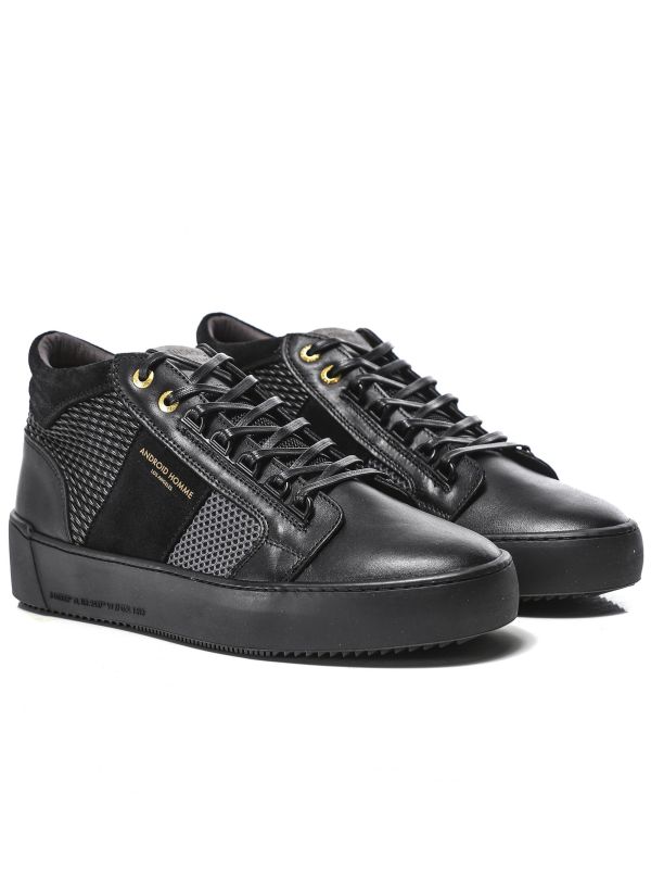 The Android Homme Propulsion Mid Geo sneakers are an innovative shoe perfect for the sneaker connoisseur. Engineered in a multi panel design, the black sneakers showcase mixed lavish leather fabrics offering a super contemporary appearance. Featuring a D-ring lace-up fastening and signature branding, whilst the innovative woven side panels lend a dynamic finish.