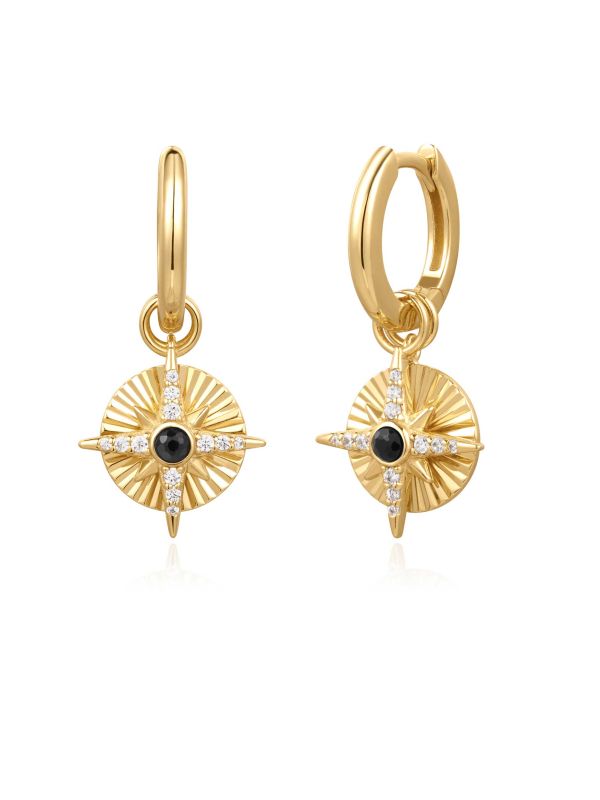 Elevate your accessory game with the Ania Haie Astrolabe Charm Huggies, a stunning fusion of elegance and contemporary design. Crafted from high-quality 925 sterling silver and adorned with luxurious 14kt gold plating, these huggies feature a striking eight-pointed star design inspired by an astrolabe. The centrepiece of black agate adds a touch of sophistication and mystique, while sparkling cubic zirconia accents bring a radiant finish.