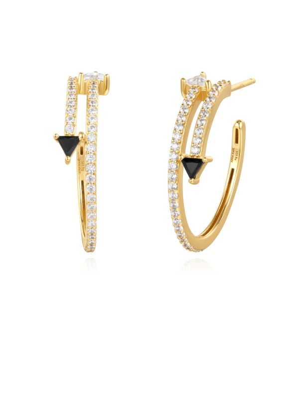 Elevate your accessory game with the stunning Ania Haie pave double arrow stud hoops. Crafted from high-quality 925 sterling silver and elegantly plated with 14kt gold, these hoops feature a chic double arrow design that adds a contemporary flair to any outfit. Adorned with sparkling cubic zirconia, including two striking black cubic zirconia triangles, they offer a bold yet sophisticated touch.