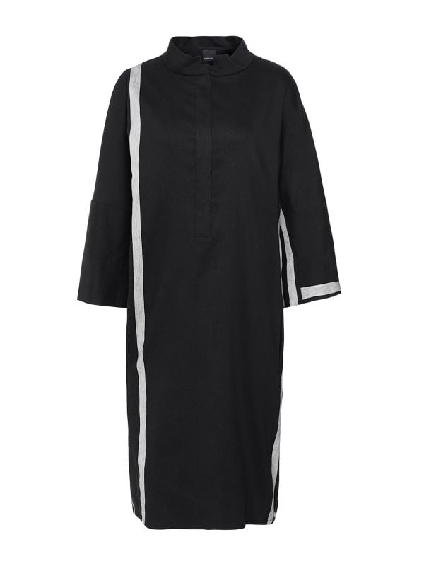 The Annette Gortz Dunca dress is a laid-back staple for your casual wardrobe, crafted in a breathable linen blend for lasting comfort on warm days. This stylish dress boasts a contemporary design, cut for a relaxed fit and complete with contrast stripe details. It has hook and eye fastenings to the front, 3/4 sleeves and a stand collar for a chic finish. Team with sandals or layer it over the matching Annette Gortz Duna pants.