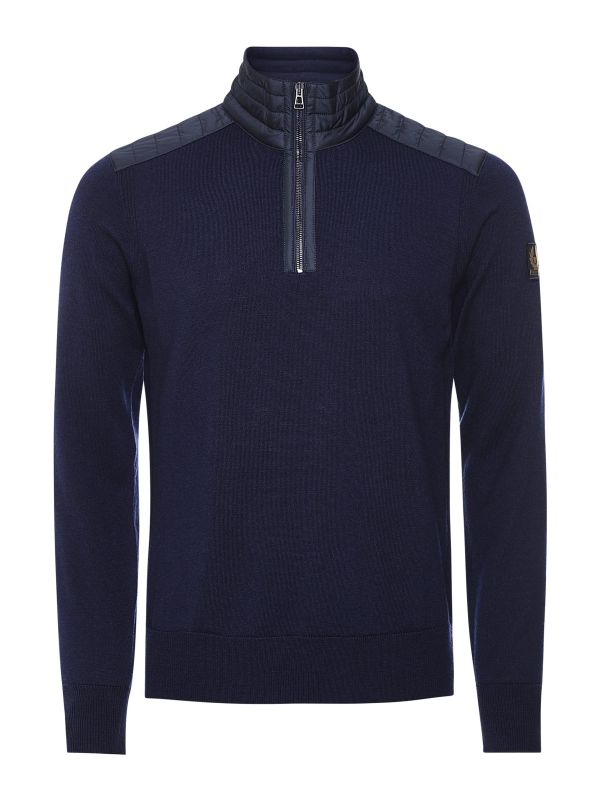 The Belstaff Kilmington sweater expertly fuses the comfort of knitwear with the label's signature military clothing inspiration. Crafted in Italy from extra fine merino wool with padded inserts to the shoulders, collar and around the quarter zipper, the charming sweater is complete with ribbed trims and side panels allowing for a greater fit and long lasting comfort.