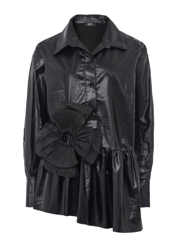 Crafted from a cotton blend with a shiny, faux leather-look, this Bize blouse is a must-have for your new season wardrobe. Featuring a classic collar and a button fastening, this shirt-style blouse is elevated by its dramatic peplum hem and oversized taffeta flower. It has long sleeves with buttons, allowing you to switch between a sleek or flared sleeve by undoing the buttons.