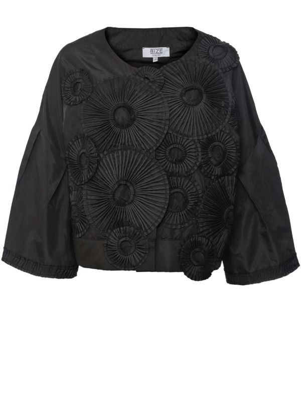 The Bize pleated circle motif jacket is a statement piece that combines avant-garde design with modern comfort. Its round neckline and concealed press-button closure create a sleek, minimalistic front, while the wide 3/4 length sleeves offer a bold silhouette, further accentuated by elasticated sleeve endings for a touch of casual ease.