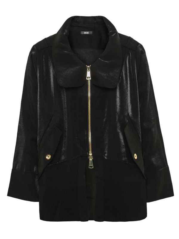 The Bize Rib Knit Detail Jacket showcases a striking design. Combining textures with a sheen fabric throughout and a rib-knit hem, this Bize jacket has a unique look that makes it easy to elevate your outfits. It has an oversized collar, a gold-coloured zipper and faux flap pockets, finished with matching gold buttons.