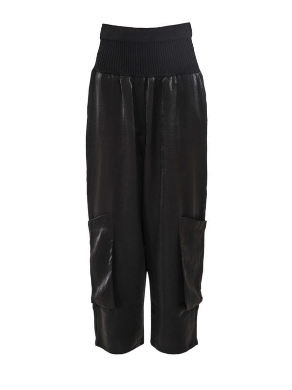 The Bize Rib Knit Waist Trousers feature a distinctive design, adding a unique touch to your looks. Crafted with an elastic rib-knit waistband and wide legs cut from lightweight sheen fabric, these Bize trousers pair well with a chunky boot. Finished with side pockets and pockets on the legs.