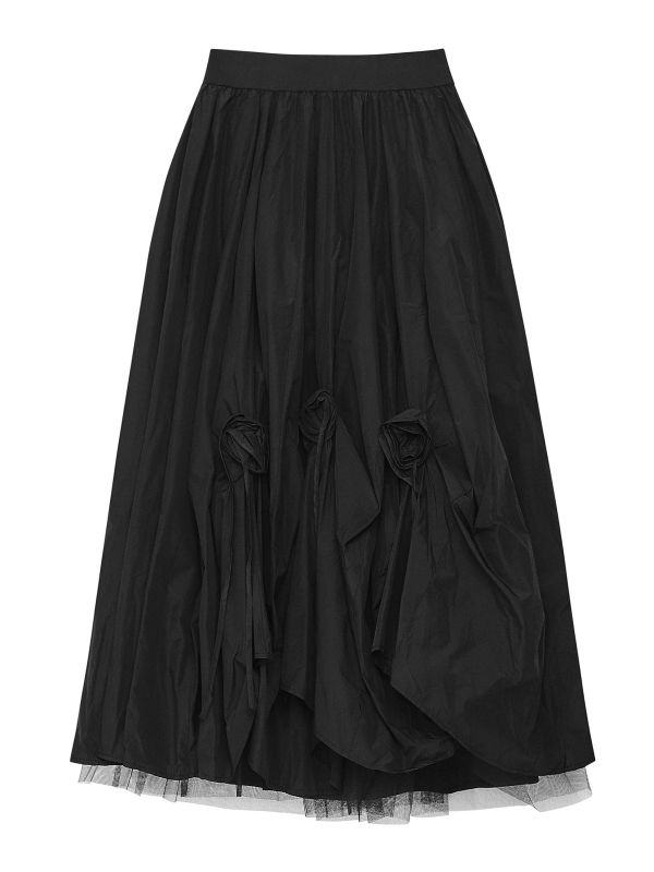 Dress up in the Bize rose taffeta skirt. This midi-length full skirt is made from a shiny taffeta fabric and has a slim waist with a visible elasticated waistband. The skirt is ruffled to the front with the fabric scrunched to create pretty roses. It has a net underskirt that is visible to the front and adds further volume.