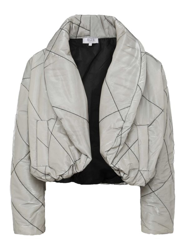 Stand out this season in the Shiny Puffer Jacket by Bize. This cropped puffer-style jacket is a statement-making style with its puffy, oversized look and shine finish. Crafted from polyester complete with a mesh finish, this Bize jacket has an open front and features an oversized collar, long sleeves and black diagonal stitching throughout.