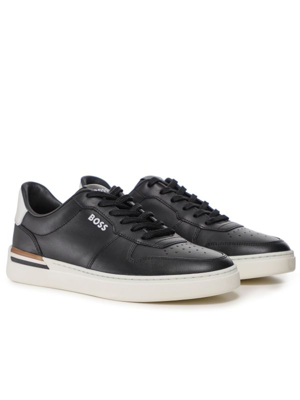 The BOSS Clint_Tenn_ltvp sneakers draw inspiration from classic tennis shoe design. Engineered in a smooth leather, the sneakers showcase a low-top silhouette with classic cupsole. Featuring a lace-up fastening, perforated toe and branded sides, whilst the striped detail at the sole adds a signature BOSS finish.