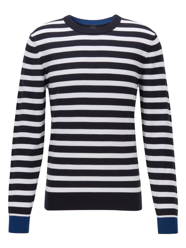 Lend your knitwear nautical inspiration with the BOSS Orelli sweater. Lovingly knitted in premium cotton yarn, the sweater offers a sumptuously soft and lightweight handle. Featuring a classic crew neck, ribbed trims and bold horizontal striped pattern, whilst the contrast colour block cuffs and internal neckline provide statement detail.