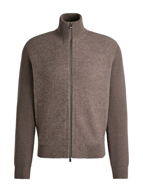 Designed with a sophisticated funnel neck and a practical two-way zip closure, it’s both versatile and easy to layer. Side pockets add a touch of functionality, while the ribbed detailing on the neck, sleeves, and trims enhances its tailored look, making the Hugo Boss cardigan an excellent choice for a refined yet modern wardrobe.