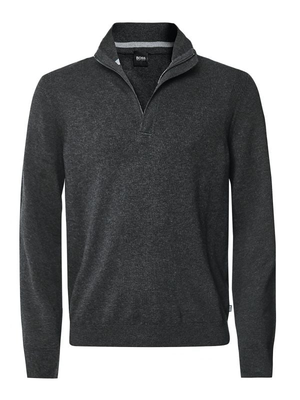 Lend your winter essentials sophisticated style with the BOSS Maneo sweater. Engineered in a premium cotton and virgin wool blend, the sweater promises warmth, comfort and a lightweight handle. Featuring a funnel collar with concealed half-zip fastening and ribbed trims, whilst the charcoal grey hue makes for versatile styling.