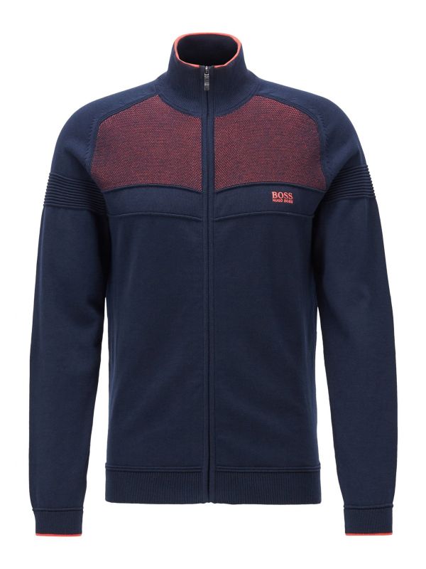 The BOSS Zamot cardigan is a dynamic design packed with sports-luxe character. Expertly crafted in knitted cotton with stretch, the navy cardigan promises comfort and exceptional freedom of movement. Featuring a funnel neck, zip-through fastening and ribbed trims, whilst the top pique panel and ottoman structured sleeves lend unique detail.
