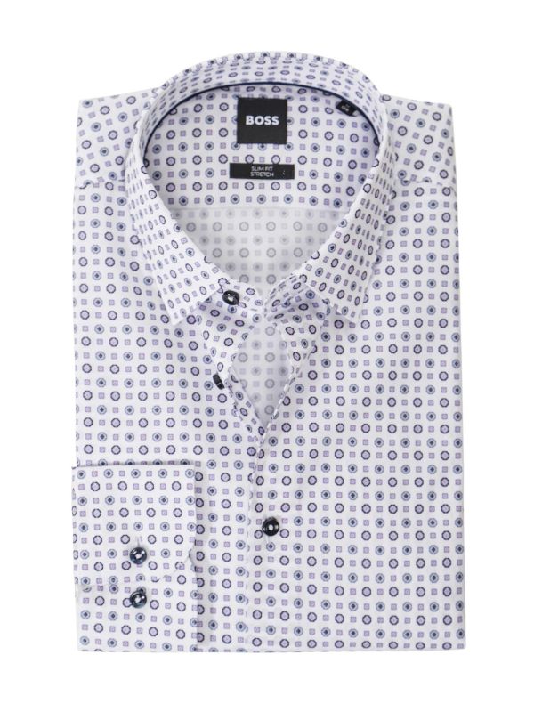 The long sleeves are complemented by adjustable buttoned cuffs, allowing for a customised fit. The geometric pattern adds a modern twist to the shirt's slim fit design, making it a versatile piece suitable for both formal and casual occasions.