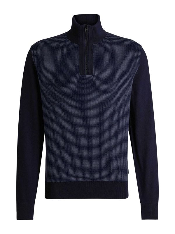The BOSS H-Dambino jumper is a sophisticated piece crafted from luxurious virgin wool, ensuring superior warmth and softness. This elegant jumper features a modern stand collar and a convenient half-zip fastening, allowing for versatile styling.