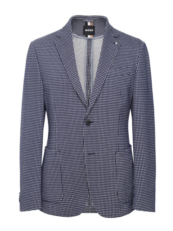 The BOSS C-Hanry-J-222 jacket is a modern piece of tailoring ideal for those smart-casual occasions. Crafted in a jersey cotton blend with stretch, the single breasted jacket is cut to a slim fit for a contoured silhouette. Featuring a two button fastening, notch lapels and kissing button cuffs, whilst the oversized front patch pockets add to the blazer's laid-back design. The Hugo Boss jacket is adorned in a textured houndstooth pattern for a tactile handle and stylish depth of character.