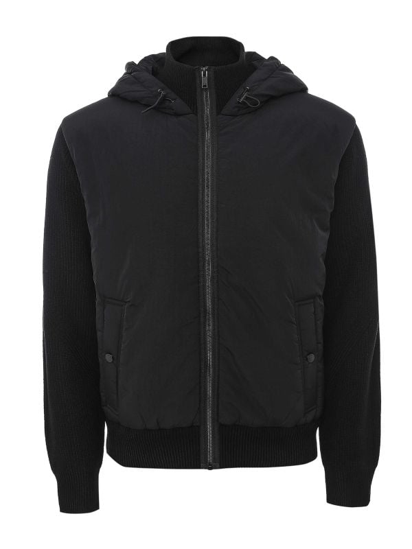 The Kiaccio Hooded Jacket from BOSS combines a quilted padded body with knitted long sleeves for a hybrid outer layer. It has a full Zipper fastening, an adjustable hood with branded toggles and two flap pockets with press-stud closures for secure storage. Ribbed collar, cuffs and hem provide a neat finish while a rubber logo patch on the sleeve offers subtle branding. Suited to layering over shirts or light knits, the jacket pairs considered tailoring details with practical everyday functionality.