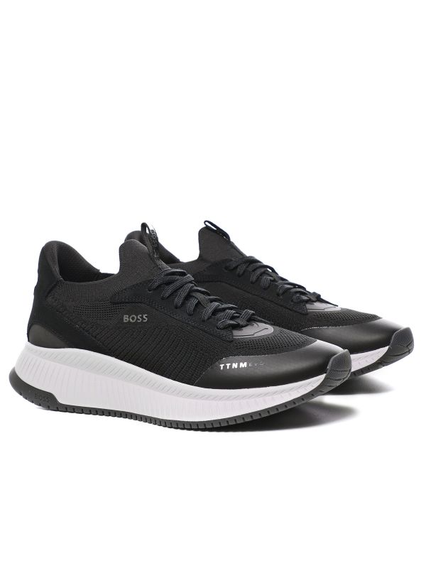 The BOSS knitted trainers are a sock-style option packed with sporty attitude. Engineered in soft knitted uppers, the black sneakers are partially crafted using recycled plastic bottles for a sustainable approach to manufacturing. Featuring a lace-up fastening, panelled design and iconic branding, whilst the fishbone sole ensures superb comfort and traction with every step.