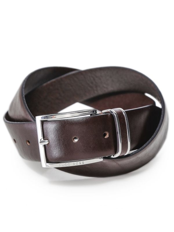 The BOSS Froppin belt will add true Italian luxury to your essentials. Hand crafted in Italy from a finely grained cow leather this superbly finished belt has a narrow rectangular metal pin buckle with a silver finish and matching metal loop with leather detail. Wear your Hugo Boss belt with your favourite pair of designer jeans or with formal pants for the office.