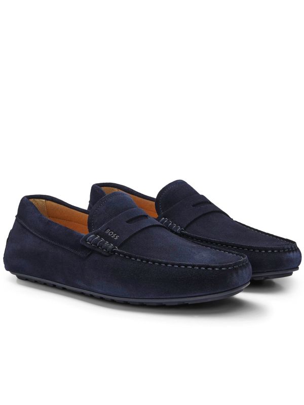 The BOSS Noel Moccasin Loafers are crafted in Portugal from suede, featuring a penny strap and distinctive moccasin stitching. A rubber driving sole with a branded heel insert provides grip and flexibility, while the cushioned insole is printed for subtle identity. Designed for smart-casual dressing, these loafers bring a polished finish to chinos or tailored Pants and transition easily for travel. Lightweight construction and a low-profile silhouette make them comfortable for extended wear.
