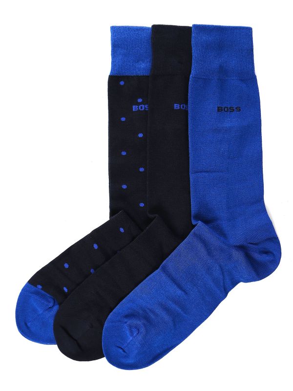 Upgrade your essentials with the three pack of BOSS socks. Showcasing two plain and a polka dot pair, the socks have been crafted in a stretch cotton blend for supreme comfort and excellent shape retention. Featuring ribbed ankle cuffs and signature branding, whilst the blue tones make for versatility when teaming with footwear and clothing.