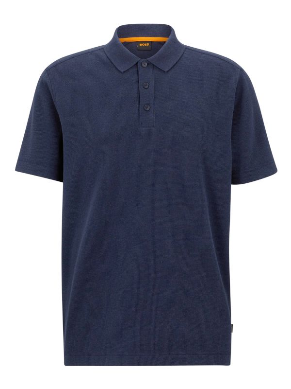 Upgrade your leisurewear with the BOSS Petempesto polo shirt. Cut to a relaxed fit, the polo has been crafted in a stretch blend with a waffle structure. Featuring a flat knit collar with three button placket and short sleeves, whilst purchasing this item contributes to the Cotton Made In Africa initiative that was set up to aid farmers' working conditions.