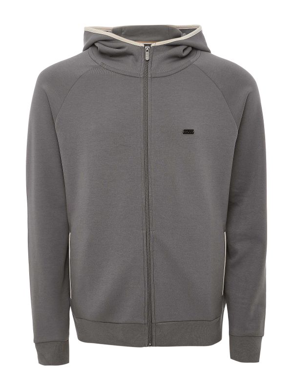 The BOSS Sense Hooded Jacket is a streamlined Zipper-through hoodie designed for considered everyday wear. Built with raglan sleeves and a neat hood for ease of movement, it features Zipper pockets with piped trims and a small metal logo plaque at the chest. A ribbed hem and cuffs give a tidy finish while the soft-knit construction provides comfortable layering. The Sense Hooded Jacket pairs easily with tailored joggers or casual Pants for a relaxed, modern look.