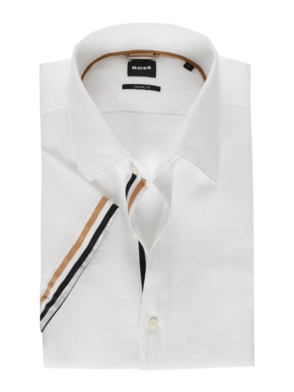 Sharpen up your summer casuals with the BOSS C-HAL-kent shirt. Crafted in a cotton and linen blend, the shirt promises essential cooling qualities. Featuring a pointed collar with button-through closure, short sleeves and a relaxed, casual fit, whilst the label's signature stripes at the cuffs add iconic detail.