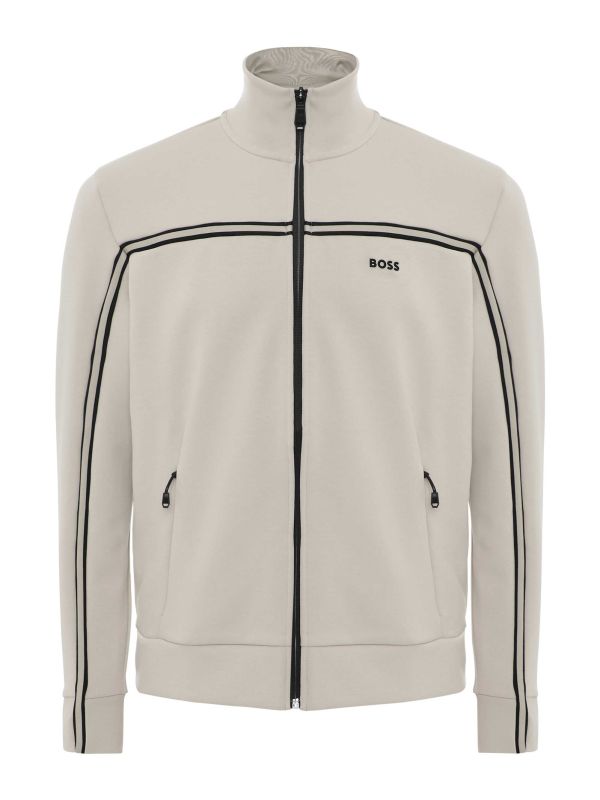 The BOSS Skaz 1 track jacket is a contemporary staple that seamlessly blends style and functionality, crafted from a premium cotton blend with just the right amount of stretch for optimal comfort and movement. Featuring a sleek funnel neck and a zip-through front, this jacket is designed for a modern fit, making it perfect for both active days and urban outings.