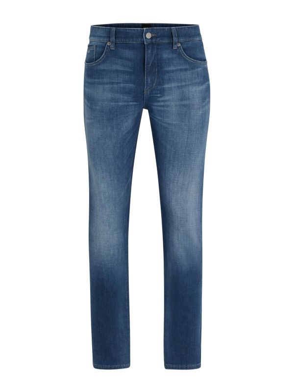 The zip fly and belt loops add a classic touch to the design, while the five-pocket layout provides both style and functionality. Engineered in a slim fit with a regular rise and standard length, these BOSS Delaware slim fit jeans effortlessly flatter the silhouette, offering a timeless yet modern aesthetic. In a versatile blue hue, they effortlessly transition from casual to semi-formal occasions, making them an essential wardrobe staple for the discerning individual.