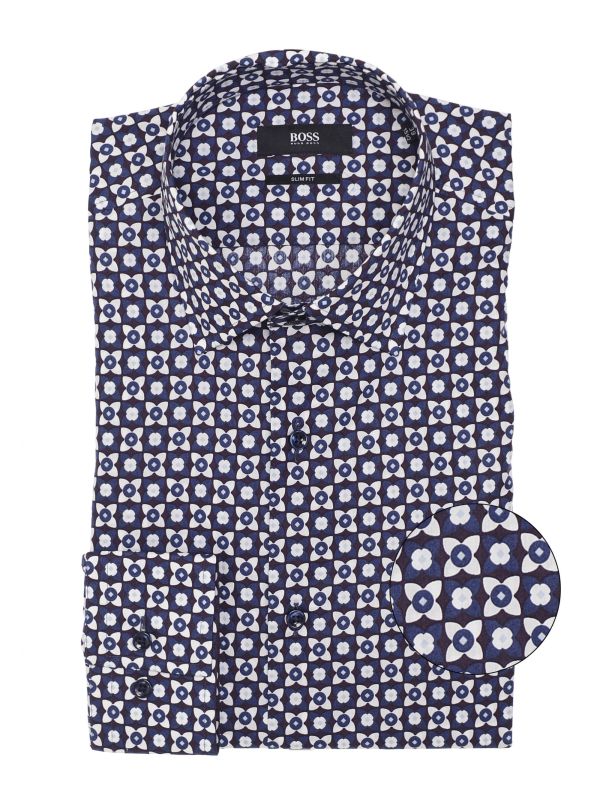 The BOSS floral Jango shirt is set to add charming pattern into your shirting repertoire. Cut to a slim fit and crafted in an Italian woven cotton, the blue shirt offers a modern silhouette and super smooth finish. Featuring a Kent collar and adjustable buttoned cuffs, whilst the geometric floral print lends playful character.