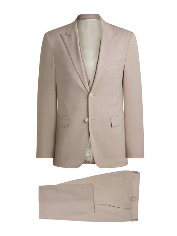 The matching waistcoat elevates the ensemble with its double-breasted closure, welt pockets, and an adjustable waist belt for a perfect fit. The matching trousers boast a four-pocket design with belt loops, completing the sleek silhouette. Cut to a slim fit, this Hugo Boss suit offers a streamlined, masculine profile—ideal for formal occasions or business affairs.