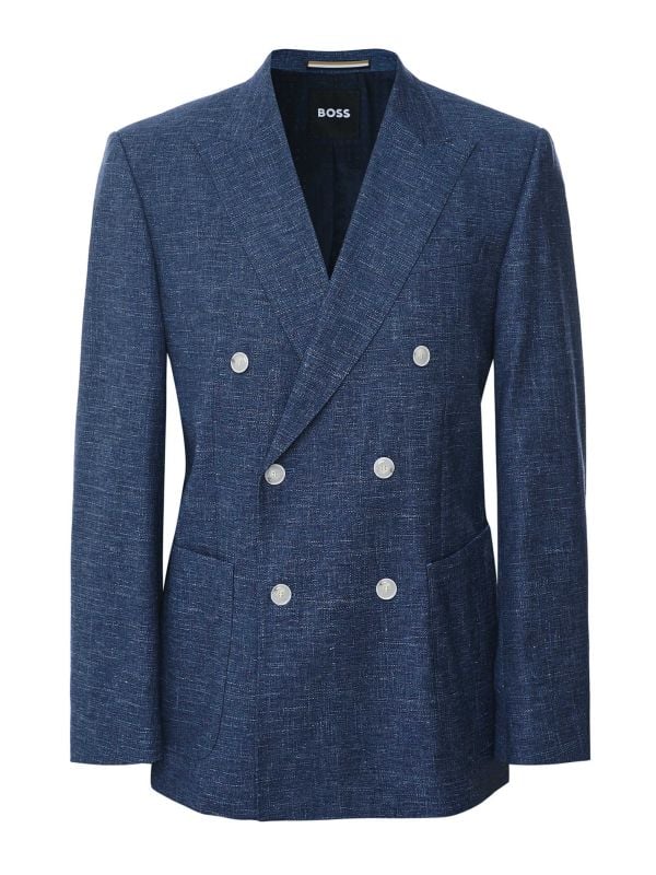 Designed with sharp peak lapels and a double-breasted closure, this slim-fit blazer features a classic three-pocket front, internal welt pockets, and double rear vents for ease of movement. Finished with buttoned cuffs, the Hugo Boss blazer is a sophisticated statement piece for refined dressing.