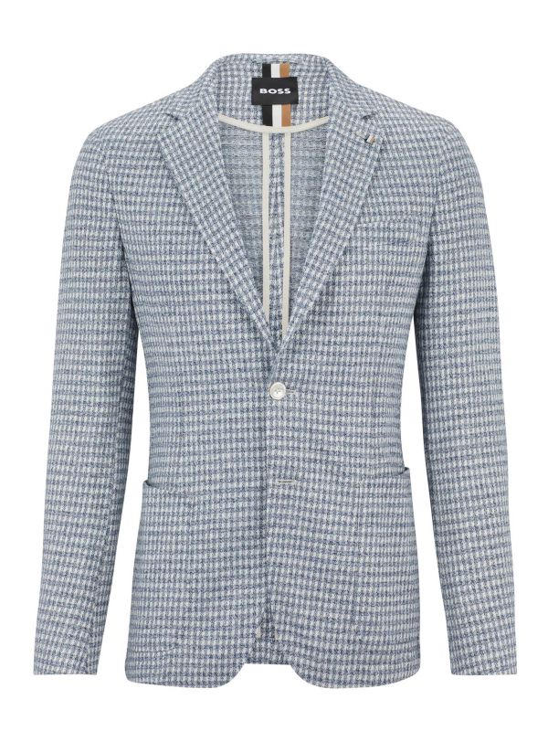 Elevate your summertime occasion wear with the BOSS C-Hanry jacket. Tailored in a linen and cotton blend, the unlined blazer has been cut to a slim fit for a flattering silhouette. Featuring a micro check pattern, two button fastening, three pocket front and kissing button cuffs, whilst the label's signature stripe lapel pin adds iconic detail.
