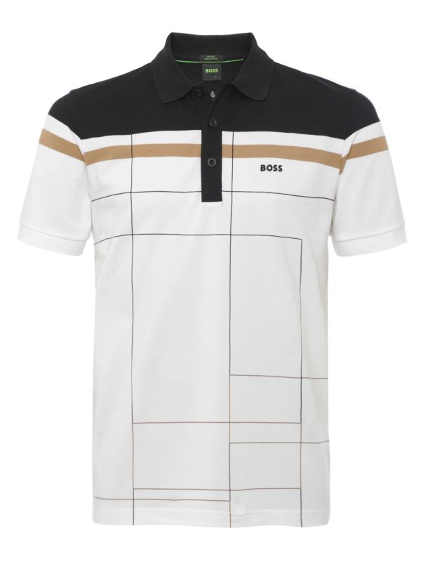 The flat knit collar and cuffs offer a refined touch, while the three-button placket and bold dynamic grid print bring a modern edge. Cut in a slim fit, the Hugo Boss polo shirt is perfect for both on and off the course.