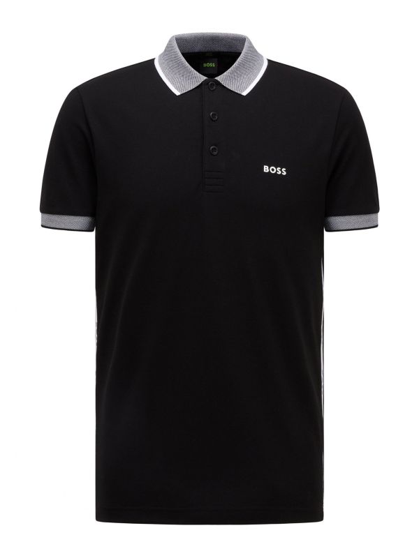 The BOSS Paule polo shirt exudes dynamic sporty appeal. Engineered in a cotton blend pique, the polo has been cut to a slim fit with stretch for an athletic silhouette. Featuring contrast flat knit trims, three button placket and chest logo, whilst the branded inserts to the side seams add iconic detail.