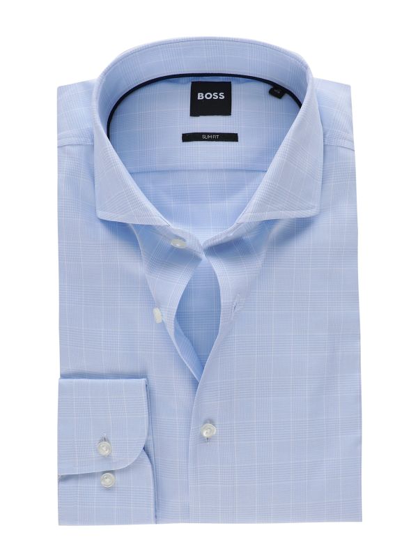 Featuring a classic Prince of Wales check pattern, this Hugo Boss dress shirt brings subtle sophistication to your look. Designed in a slim fit, it creates a streamlined, flattering silhouette that pairs effortlessly with tailored trousers or dark denim, making it an ideal option for both business and smart-casual occasions.