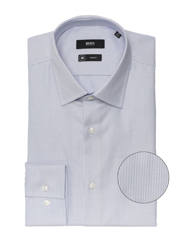 Engineered with the business traveller in mind, the BOSS striped Jango shirt is ideal for keeping up appearances when on the move. Tailored to a slim fit and crafted in a premium stretch cotton poplin, the shirt offers a streamlined silhouette, exceptionally crisp appearance and essential comfort. Featuring a Kent collar, inner placket tape trim, adjustable cuffs and pearlescent buttons, whilst the twill pinstripe pattern makes for a timeless aesthetic.