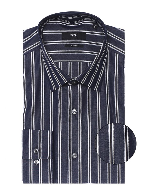 Add distinctive style to your business profile with the BOSS striped Jango shirt. Cut to a slim fit and crafted in premium woven cotton, the shirt offers a modern silhouette and satin-like finish. Featuring a Kent collar and adjustable buttoned cuffs, whilst the tonal double stripe pattern creates a handsome depth of character.