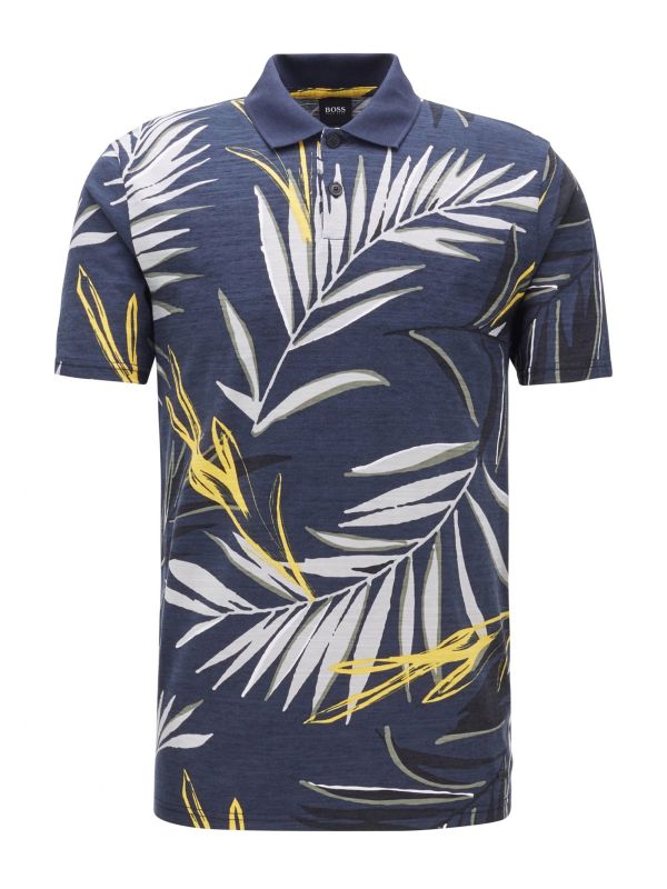 The BOSS Peleaf polo shirt is a summer-ready staple ideal for off-duty occasions. Cut to a regular and crafted in premium slub cotton jersey, the navy polo has been garment washed making for a wonderfully soft texture and lightweight handle. Featuring a flat knit collar and two button placket, whilst the bold palm leaf print exudes vacation wardrobe style.