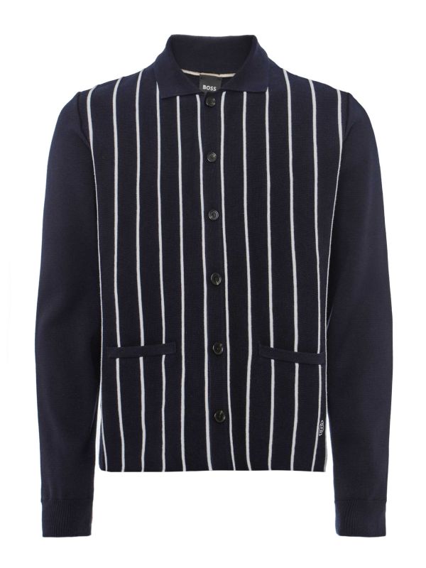 The BOSS Tripoli cardigan is a sophisticated piece crafted from premium knitted cotton, ensuring both comfort and style. This collared, button-through cardigan features a distinct striped pattern on the front body, adding a touch of contemporary flair to its classic design.