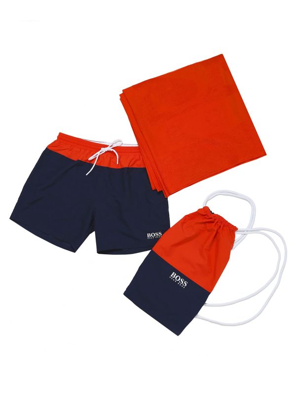 The BOSS beach set would make the perfect style statement when on vacation this season. Comprising of a beach towel, swim shorts and matching drawstring bag - each showcasing a bold colour block design and signature branding. The shorts feature an elasticated drawstring waist, three pockets and split vents, whilst the towel has been crafted in pure woven cotton for unbeatable comfort.