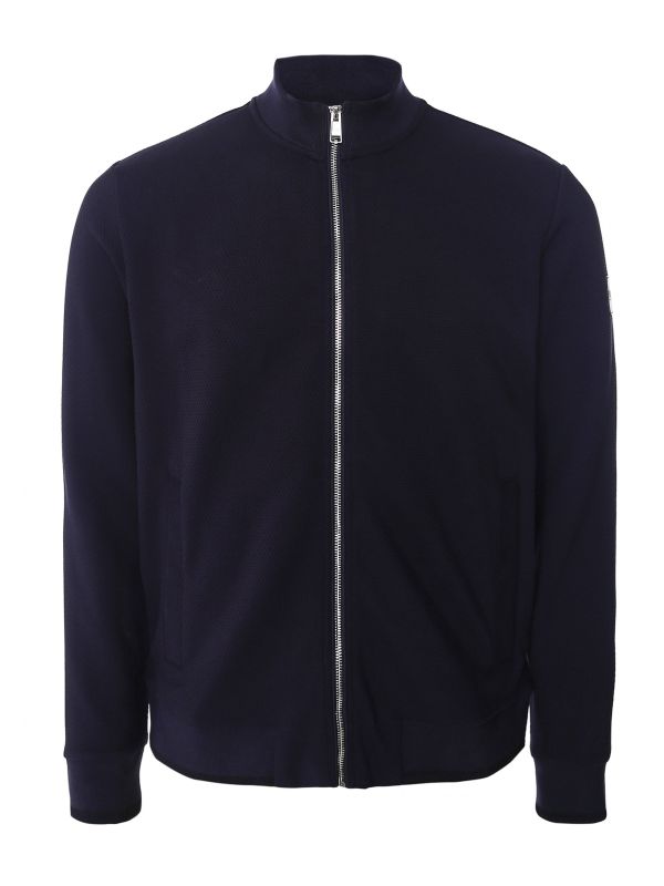 The BOSS Sommers 45 sweatshirt is a super sleek option that blends the comfort of knitwear with sporty detail. Expertly engineered in a cotton poly blend with stretch, the sweat has been given a waffle knit construction for a soft and tactile handle. Featuring a stand collar, zip-through fastening, ribbed trims and welt pockets, with the deep navy hue making for handy versatility to style with separates.